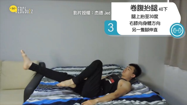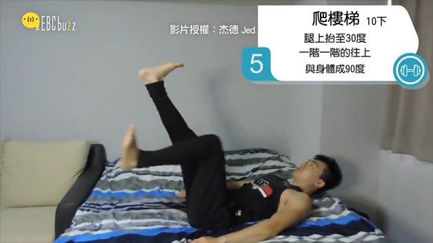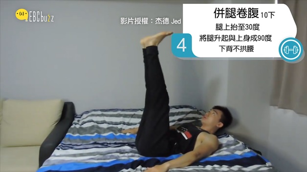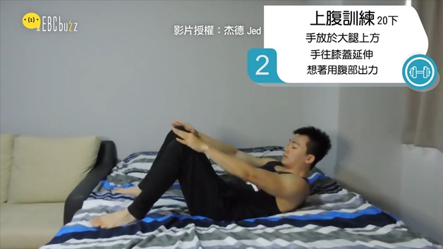每天都忙到工作沒時間運動嗎?睡前放下手機躺著也能瘦! 懶人必備的床上雕塑腹肌,別找藉口了,快動起來吧!廣告 - 請繼續往下閱讀廣告 - 請繼續往下閱讀 第一招 屈膝抱腿20下 腳舉至90度,雙手畫圓碰觸腳踝,感受上腹肌用力廣告 - 請繼續往下閱讀廣告 - 請繼續往下閱讀 第二招 上腹訓練20下 手放在大腿上,往膝蓋延伸,注意要使用腹部用力 第三招 卷腹抬腿40下 腿上抬30度,右膝往身體彎曲,另一腳伸直 第四招 併腿卷腹10下 腿上抬30度,將腿升起至與上身成90度,注意下背部拱腰 第五招 爬樓梯10下 腿上抬30度,一階一階往上踩至與上身成90度