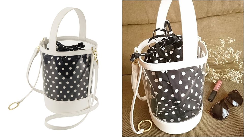 第一款就是台灣也買得到的GU!雖然是透明材質,卻多了今年流行的圓點內襯(可拆除),時髦又不用擔心包包裡面的東西被看光光~輕巧的水桶包設計無論手拿或斜背都適合,共有4種色系可選,休閒和甜美兼具,推薦給PVC透明包的初心者!