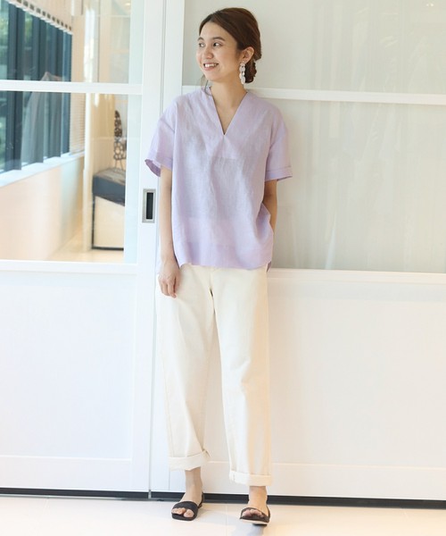 這件法國亞麻布材質的上衣,有著優雅的柔嫩薰衣草紫色。領口的開襟設計很有流行感,即使打扮休閒,也能表現清新脫俗的形象唷。薰衣草紫色不論搭深色或鮮豔色都很適合,超推薦喔♪