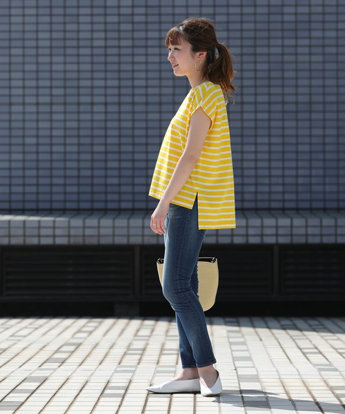 這件船型領T恤的後衣襬較長,不必擔心背影不好看。衣服布料很薄,紮進褲子中也不會讓腰際太突出,也可以紮進比較蓬鬆的裙子裡唷!
