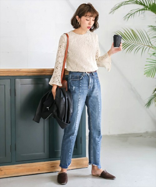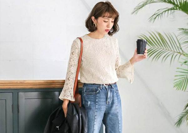 這件微高領上衣的透明感恰到好處,很適合打造成熟風穿搭。袖子不但能漂亮地掩飾上臂,整件都是蕾絲也給人涼爽的感覺。搭配基本款的丹寧褲、連身裙,或外面搭件夾克穿起來都很好看唷!