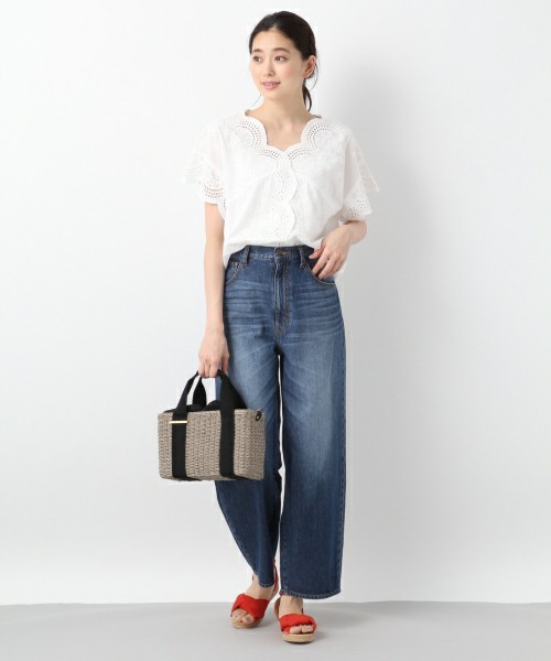 這件孔眼蕾絲上衣,可以讓胸口看起來很漂亮!圓形剪裁的V領很有女性氣質,非常柔美。因為是帶透膚感的材質,很適合作為夏日涼爽穿搭的單品。