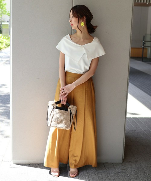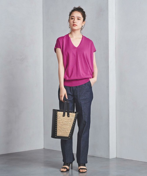 顏色鮮艷的上衣充滿設計感,展現成熟風格♪衣服下襬可以做出寬鬆的感覺。背面也是V領設計,讓背影看起來也非常有女人味。