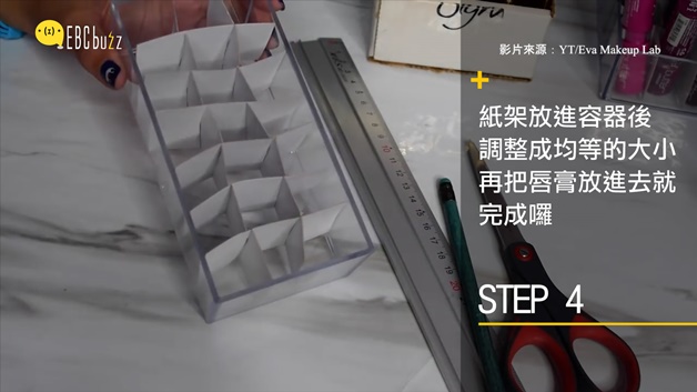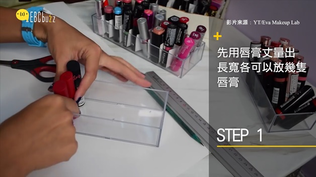 接著先以唇膏為單位,量出值的橫的可以各放幾支唇膏,當然存貨多就找大一點的容器囉థ౪థ