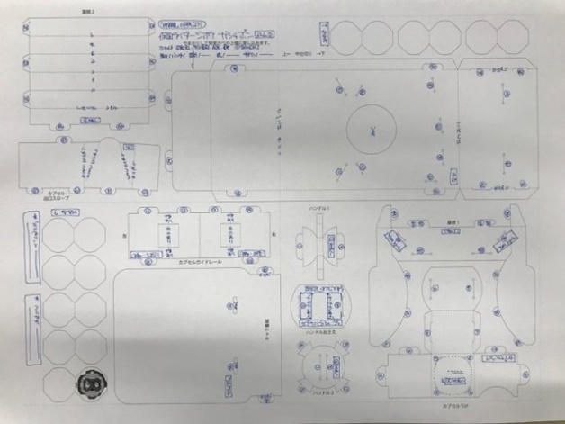 這款扭蛋機從由於還是針對兒童的附錄,因此除了完全複製之外還要想出淺顯易懂的組合設計,設計師在利用紙本完成demo後,經過數次的討論終於完成最後的設計圖。