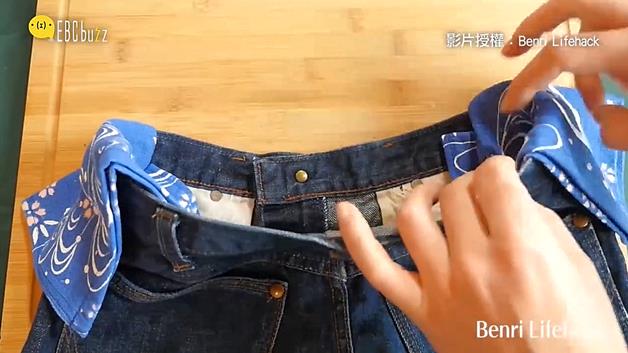 要先把牛仔褲洗一洗,然後把毛巾或是手帕,包住腰圍兩側