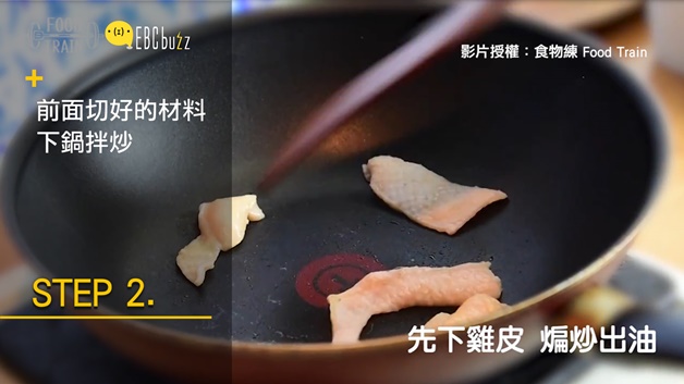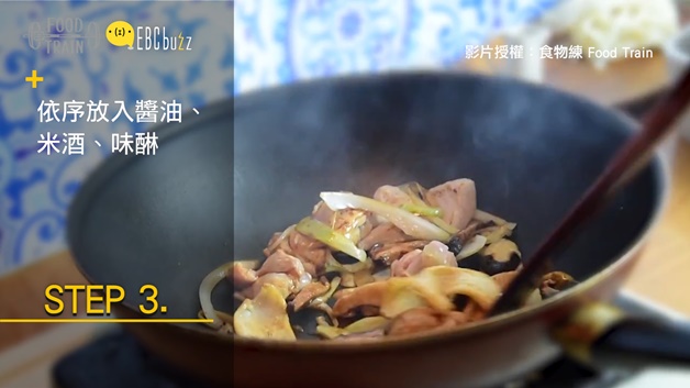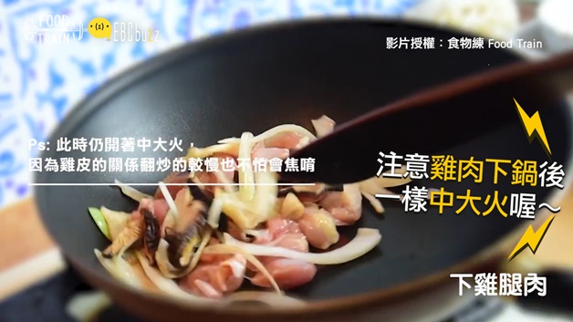 看吧!就說要留下雞皮,這麼快就出場惹~開中大火~先把雞皮炒到出油~~~再來這步驟最簡單惹~把所有你剛切好的洋蔥、香菇、青菜還有雞肉丟下去炒~在炒的時候火不用調整喔~~(翻炒的動作如果和樹懶一樣慢也不用怕~有雞皮幫你~就不怕燒焦)
