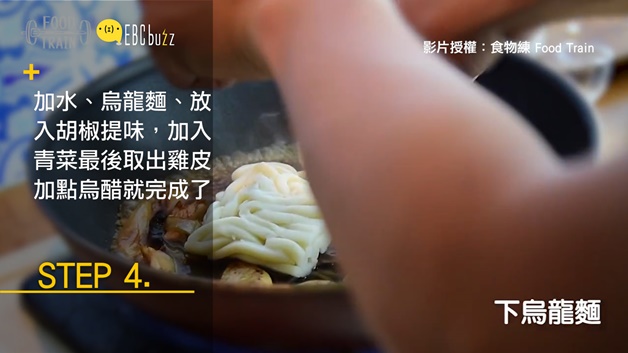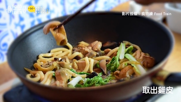 終於終於~重頭戲!放入主角烏龍麵,再放青菜讓顏色上看起來好吃一點~之後再炒一炒就差不多惹~記得取出之前的雞皮,要把雞皮放在鍋內小編也不反對啦~只是油了點~~~最後的最後一小步驟放入烏醋~再炒一下就可以起鍋啦~