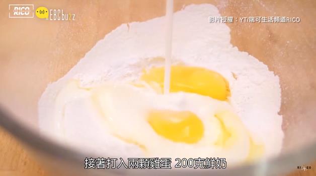 然後打進2顆雞蛋還有200公克的鮮奶,攪拌均勻~~~~