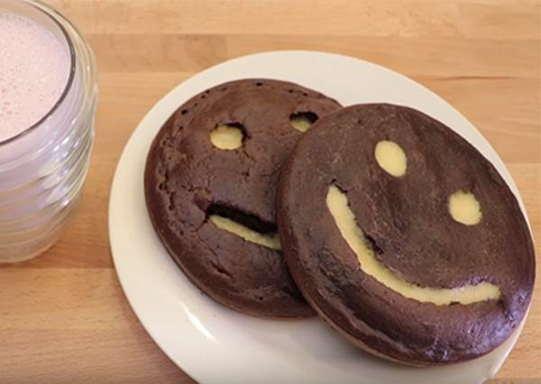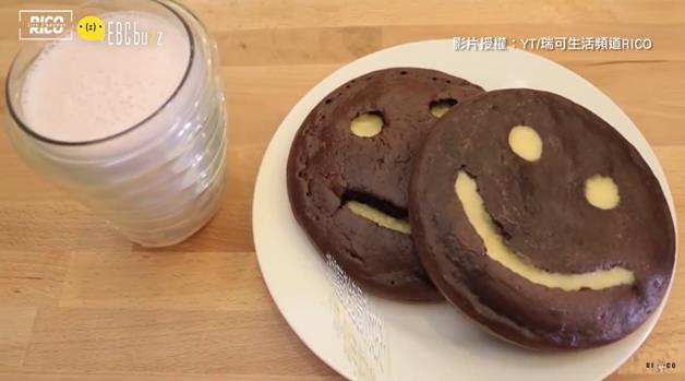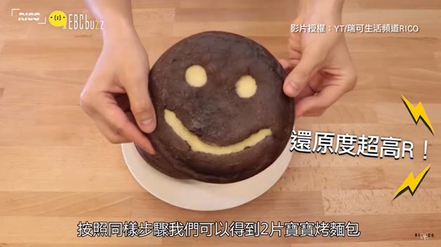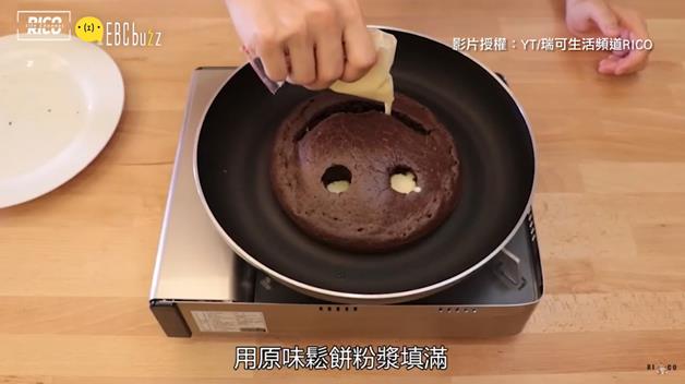 把烤好的鬆餅,挖出眼睛還有嘴巴(莫名可怕....)然後放進平底鍋裡面,用原味鬆餅糊填滿