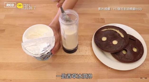 再來就是寶寶奶昔了,步驟超簡單:牛奶+草莓+一匙香草冰淇淋