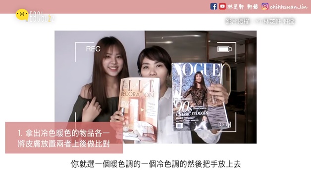 首先最直接的分辨法就是找到冷暖色調的物品,比如說雜誌或是布等等,把手放在上面對比之下,相對白的那一方就是你的皮膚色調囉~