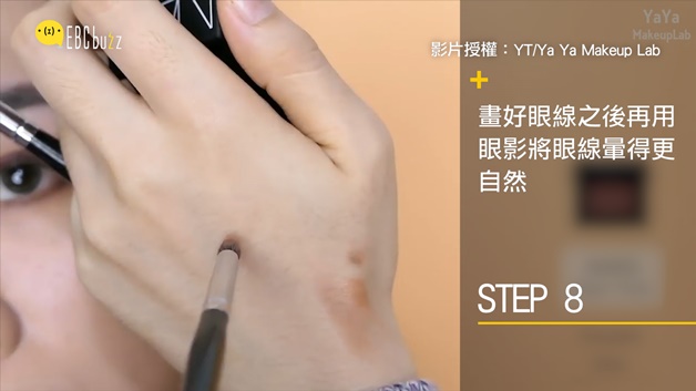 化上咖啡色眼線後,再用鉛筆刷沾取眼影將眼線暈染得更自然一些