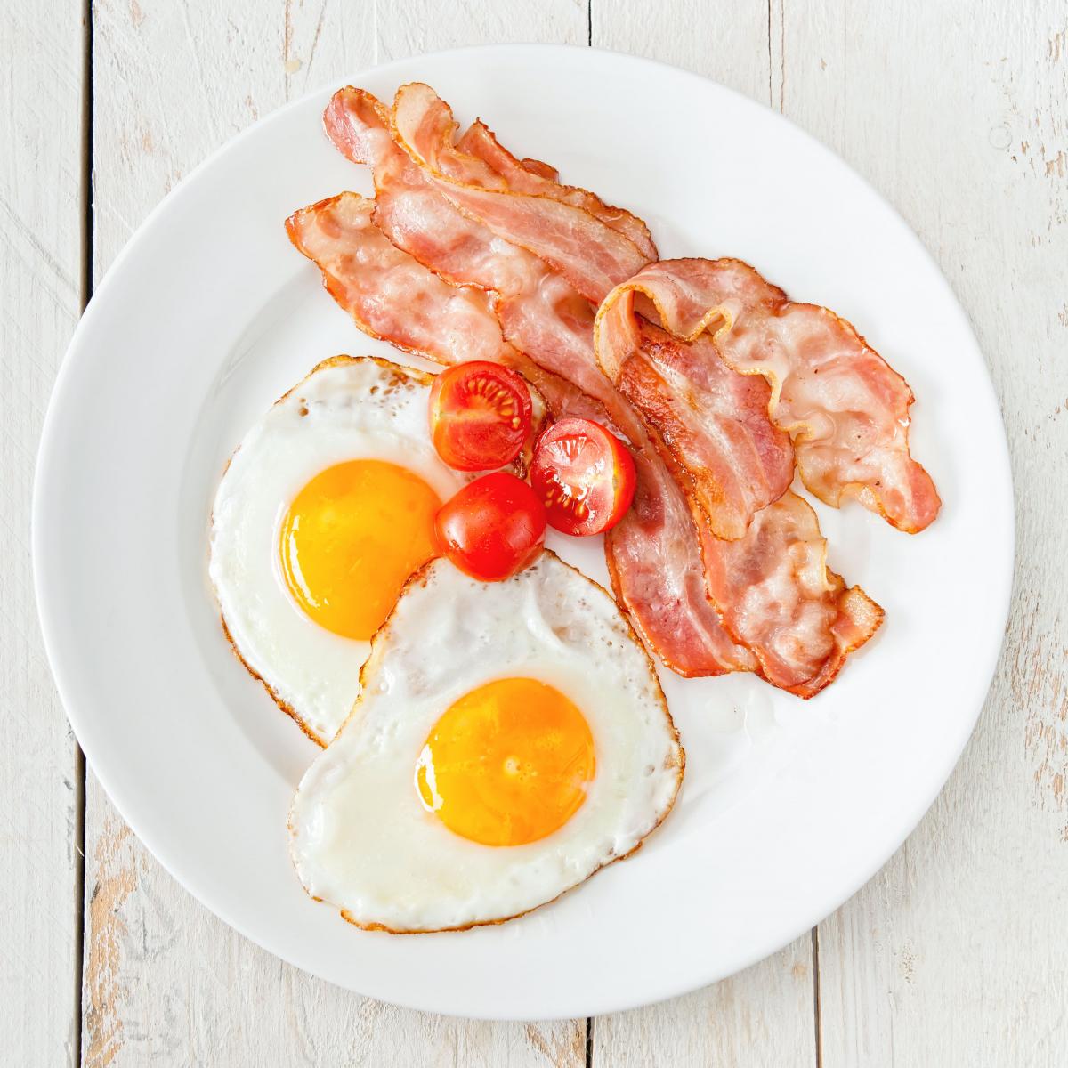 2.用同一個平底鍋煎雞蛋,將雞蛋打入培根油脂中(您也可以將雞蛋打入量杯,並小心地倒入鍋中,以免濺出熱油),以你喜愛的方式煎蛋,熟了之後放入盤子。
