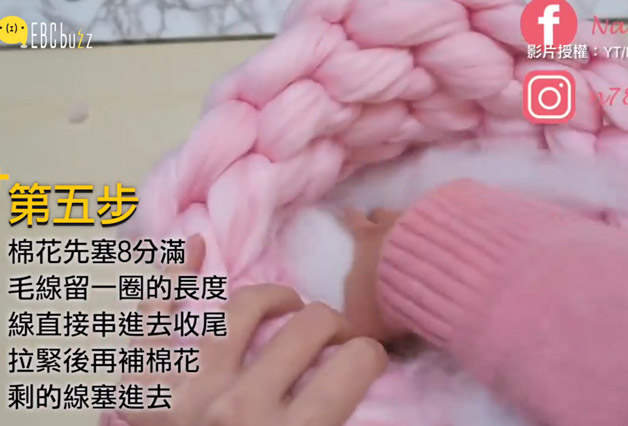 另外一邊將適當的棉花塞好塞滿,塞太多會容易將毛線撐開,反而會不好看唷!