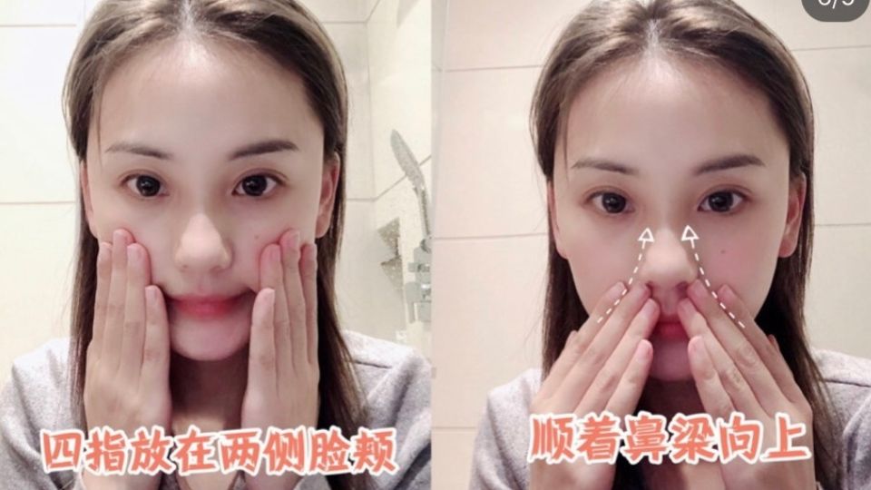 將兩個手掌攤開放在顴骨兩邊,再從顴骨滑向鼻樑兩邊來回按摩,每次做30次。