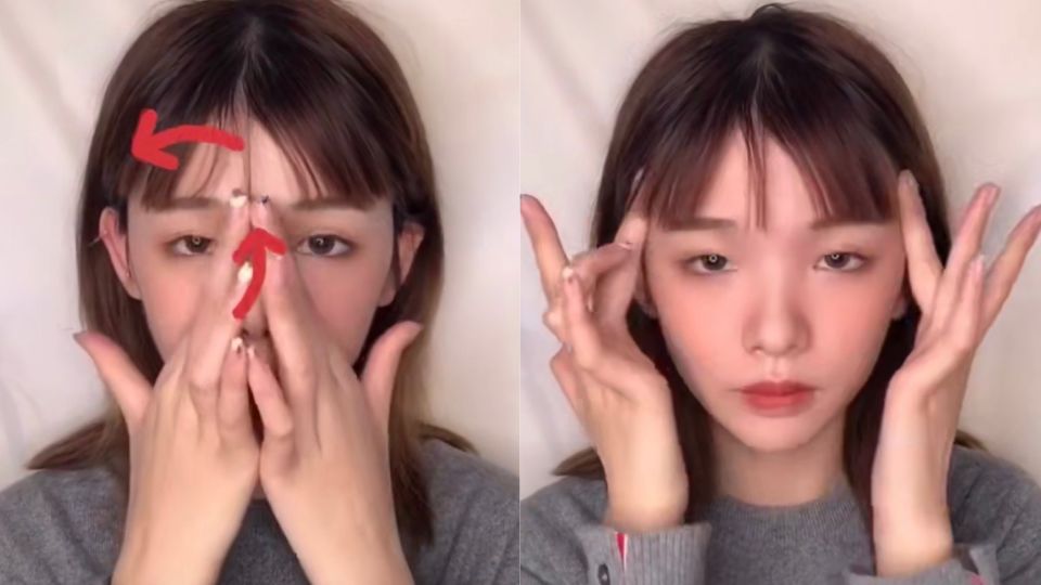 將手指沿著鼻樑兩邊往上推至額頭,在按摩道兩旁的太陽穴,呈現一個倒L型的方向,能夠有效去除抬頭紋,每次做30次。