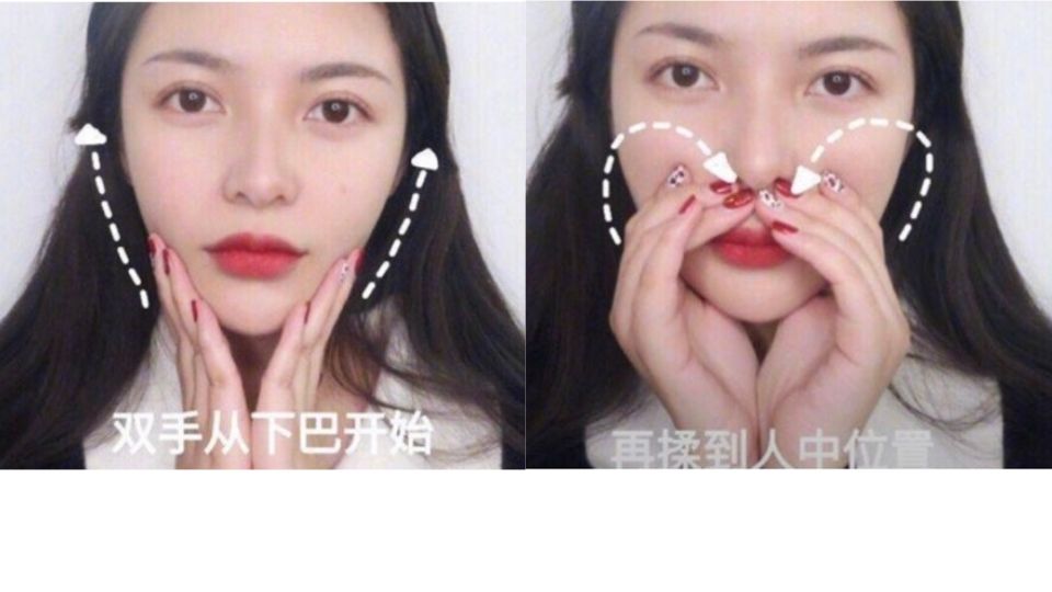 將雙手的手掌由臉頰兩邊顴骨的位置向上提拉至太陽穴,再慢慢順著臉部的輪廓往下滑至下巴!每次做30次。