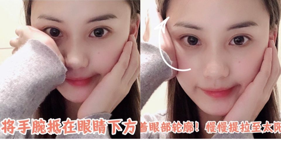 兩個手掌攤開平行放在鼻子兩邊的臉頰上面,再將兩個手掌分別大弧度向太陽穴的方向提拉臉頰的肌肉,還可以有效撫平皺紋,每次做30次。