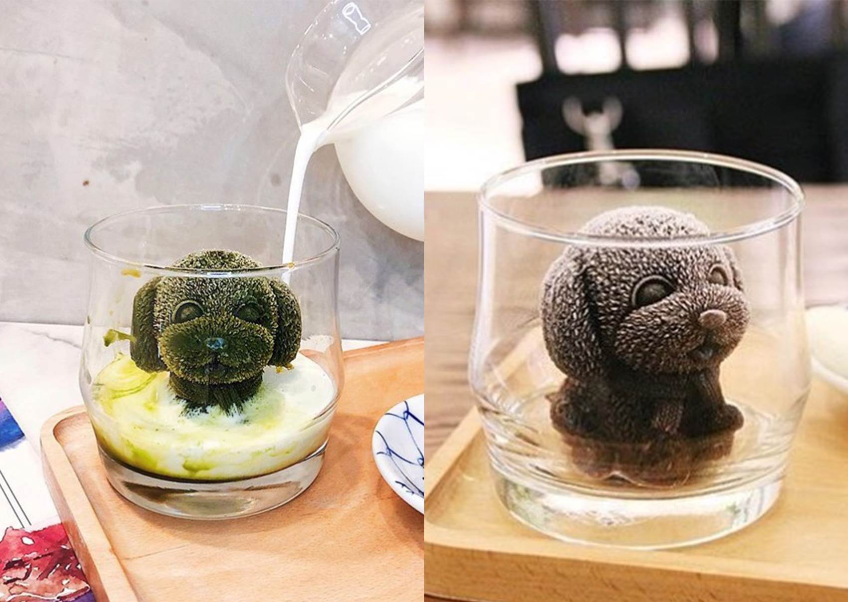 這家位於中和的療癒系咖啡廳,有著超級無敵卡哇伊的飲品,客人們幾乎都是衝著這杯可愛的「狗狗牛奶浴」而來,有三種口味的狗狗可以挑選,有咖啡、抹茶、可可,不同口味的狗狗都會是不同的顏色哦!等到狗狗一上桌,可以看到它乖乖的坐在透明玻璃杯裡面,超級療癒又可愛!