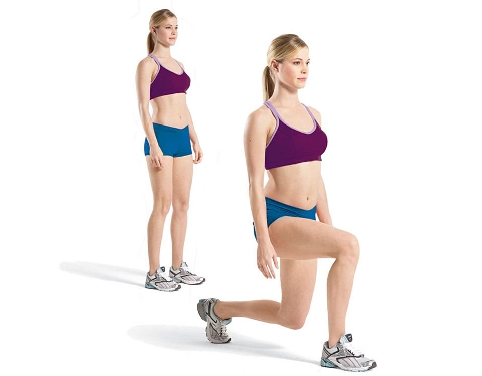 將雙腳打開至骨盆寬度,接著將左腳向前伸、右腳往後屈膝,記得背部和腰部維持挺直狀態不可以駝背,另外右腳膝蓋不可以碰地,這個動作可以伸展到臀部和大腿的肌肉線條,是最具代表性的下半身運動之一。
