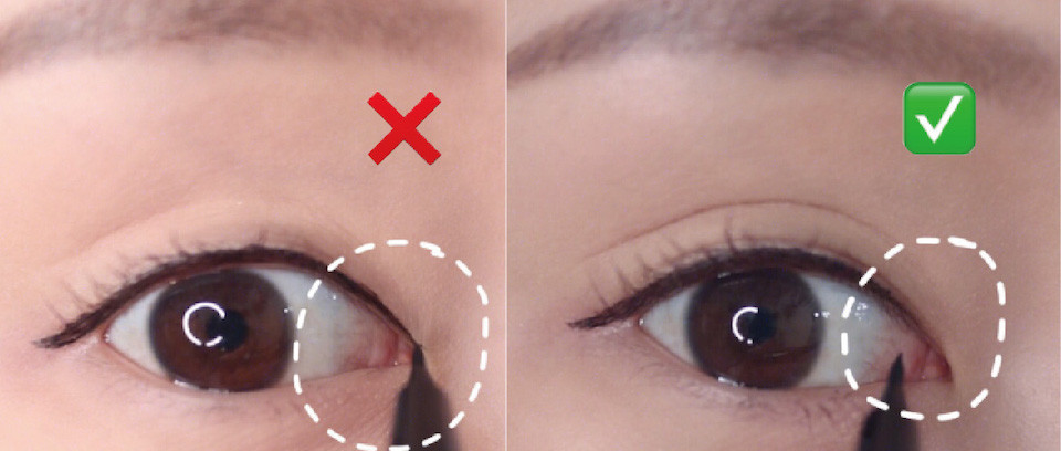 「內眼線」是所有眼線造型的基礎,正確的內眼線應該畫在睫毛根部,而不是內眼瞼上!畫在內眼瞼上非常容易暈妝,因此許多抗暈的眼線產品並不是不好用,而是在錯的位置無法發揮實力,沒幾分鐘就暈毀眼妝!新手來說,編推薦使用眼線膠筆來畫內眼線。因為眼線膠筆的筆芯較硬、順滑,同時有著類似於筆的觸感,對於新手、手殘黨來說會更好掌握。