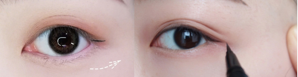 外眼線因為要拉出細長、尖銳的尾巴,更建議使用「眼線液筆」,透過毛筆形狀的筆尖來勾勒眼線。我們可以先從眼尾往斜上方約10-15度,畫出外眼線的底(下圖中箭頭方向)