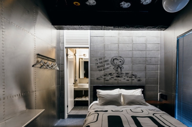 一打開門就來到太空艙!金屬風牆面透著微光,連桌面都是銀色金屬,科技感直接MAX!天花板上還有星球跟史努比漂浮呦~ (有NASA夢的男友們搞不好會很想住這間XD)