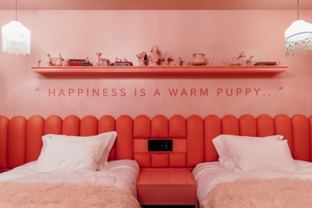 將將!超級特別的全粉紅色套房~一眼看去彷彿來到經典電影「布達佩斯大飯店」的世界!牆上放滿了史努比裝飾,白X各種階調的粉色,拼湊出超級少女風的氛圍~