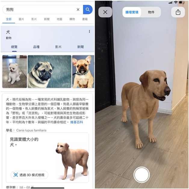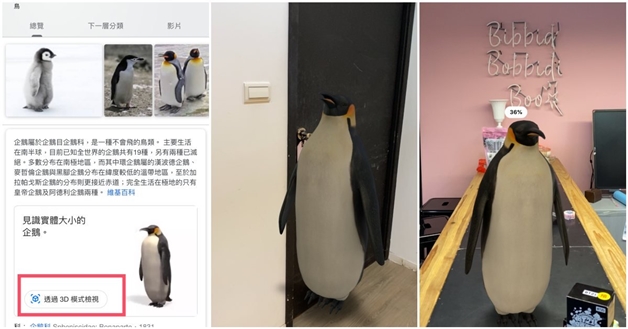 「AR動物預覽」適用於支援AR功能的手機,只要打開Google搜尋引擎網頁,或使用App《Google Chrome》(記得更新到最新版),輸入老虎、獅子、企鵝等動物的名字(不限語言),點選「透過3D檢視模式」後,就能將動物「召喚」到家裡。動物會以1:1真實比例重現在手機中,當然也可以用手指縮放它至你喜歡的比例,或移動它的位置。