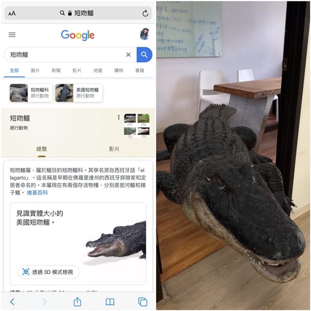 手機小姐覺得猛獸類(短吻鱷、老虎、棕熊)的模樣真的相當真實,尤其是短吻鱷,觀看時內心會有莫名的緊張感XD。目前支援AR模式的動物共有24種,包括熊貓、獅子、老虎 、獵豹、鯊魚、刺猬、鴨、企鵝、狼、鮟鱇魚、山羊、蛇、鵰熊、短吻鱷、馬、德蘭矮種馬、金剛鸚鵡、巴哥犬、烏龜、貓咪、狗、羅威那,大家在家可以試試看囉!