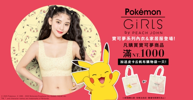 適合旅行的夏天卻不能出國?就讓寶可夢陪你一起在家抓寶吧!今年春天剛上市的 PEACH JOHN 姊妹品牌 「GiRLS by PEACH JOHN」主打年輕族群,自6月17日起,台灣也買的到在日本話題熱賣的寶可夢系列商品,!寶可夢的皮卡丘、伊布、胖丁等人氣角色現身在內衣、睡衣及束口袋等多款商品,從內到外為生活帶來滿滿的寶可夢活力!
