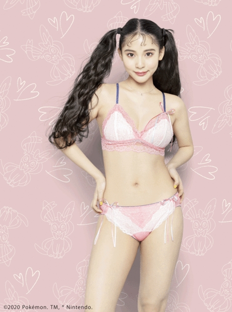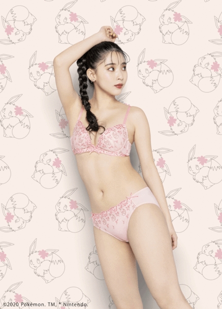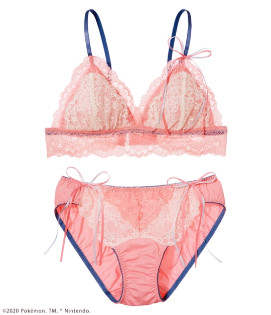 以仙子伊布為概念,舒適薄墊的無鋼圈罩杯,加上整圈粉紅蕾絲滾邊,搭配藍色的細肩帶,更增仙氣!