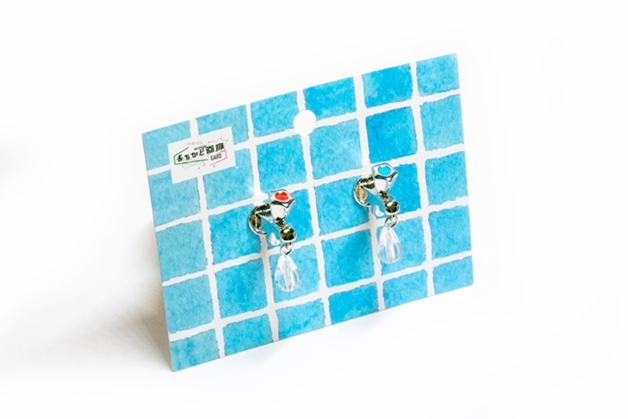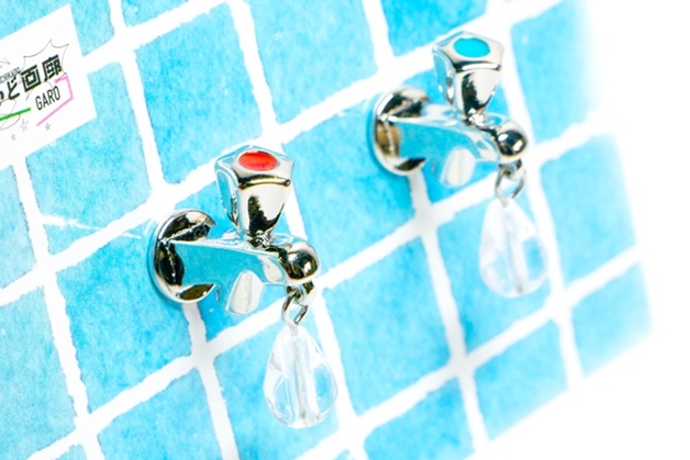 而他們最近也與雜貨品牌合作,推出了一系列周邊小物,首先是非常精緻可愛的水龍頭耳環,依照真實的冷熱水/紅藍色水龍頭製作,後面的包裝紙版也是仿照澡堂的藍色磁磚,是不是非常可愛呢?