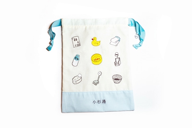 此外還有非常實用的束口袋,上面有著與日本澡堂相關的圖案,像是黃色小鴨、澡盆,以及泡完澡之後一定要來一瓶的玻璃罐牛奶,真的超可愛的!