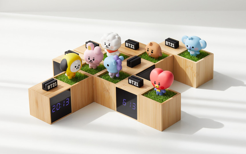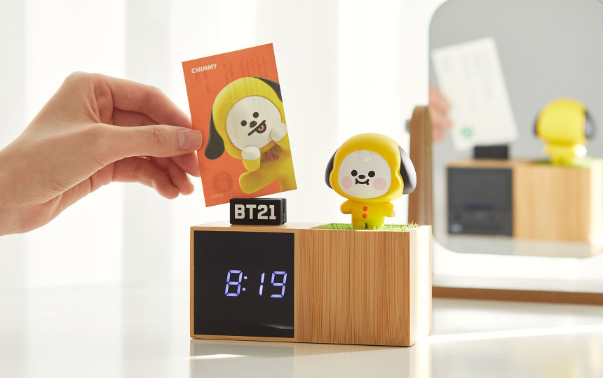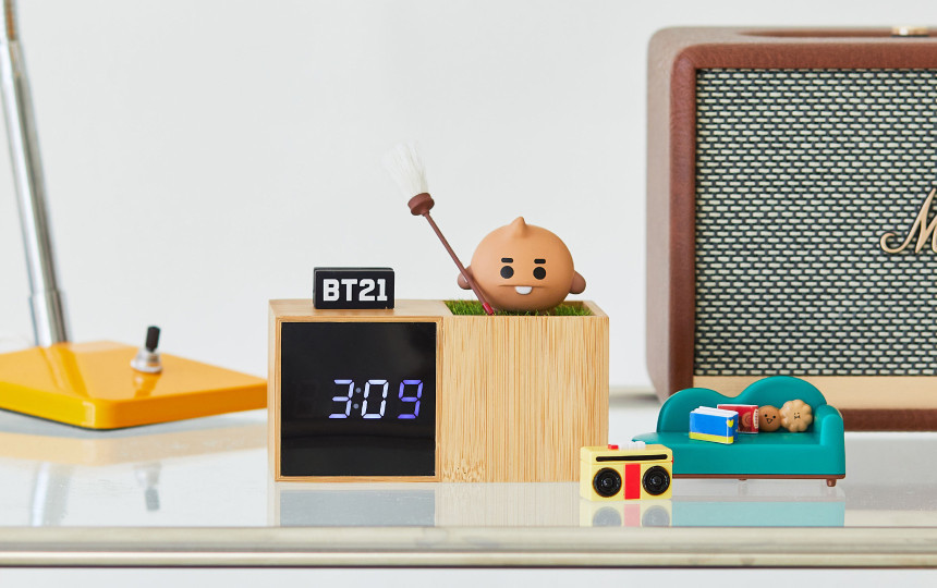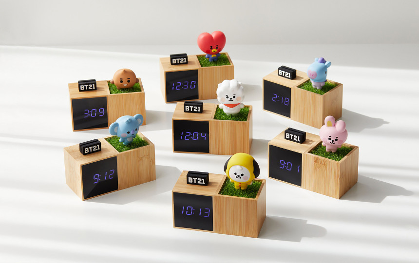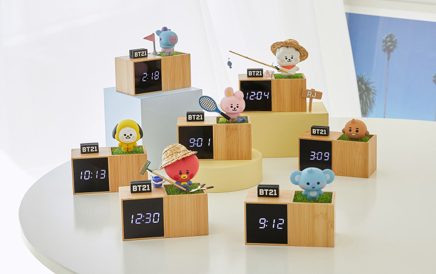 這次BT21推出的「數位時鐘」,一共有七種款式可以選擇,時鐘選用超有質感的木質底座搭配黑色LED顯示屏,再加上最萌的BT21公仔,而且每一隻BT21公仔腳下還設計了一小片綠色草皮,讓整個時鐘看起來簡單清新又可愛,也能在忙碌的生活中幫大家增添一點綠意,超級貼心!