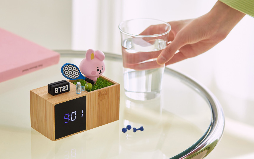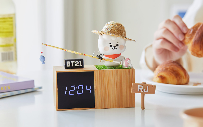 另外,還能將名片、便條紙放進在時鐘上的「BT21」裡,實用性超高!而且一組「BT21數位時鐘」不但會有一隻BT21公仔,也會附有一些小配件讓大家可以裝飾時鐘,像是RJ的釣魚裝扮、COOKY的啞鈴&網球用具等,讓時鐘看起來更加可愛活潑,同時讓生活充滿活力!