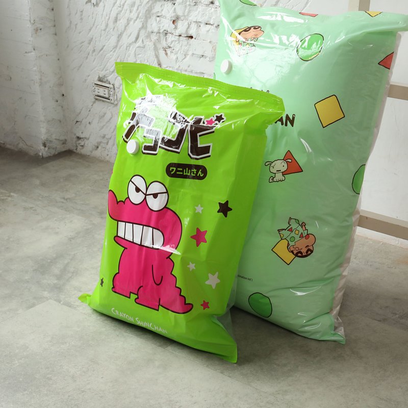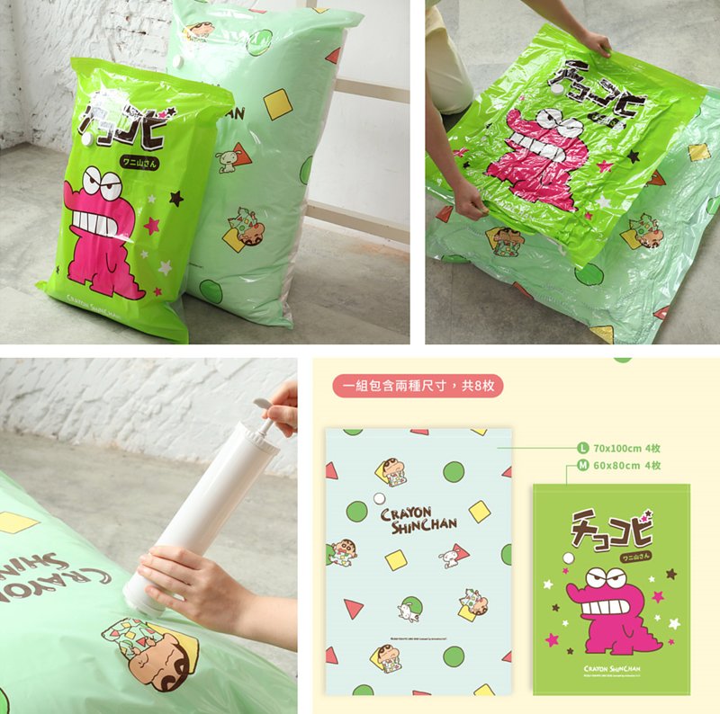 小編不得不說這款真空壓縮袋實在過於可愛!壓縮袋的材質搭配巧克比餅乾的包裝,宛如壓縮袋裝的就是巧克比餅乾啊XD,將衣物或棉被放入壓縮袋中會不會都充滿巧克比的味道(笑),除了巧克比款式外,也有尺寸較大的小新睡衣款,可愛度也是破表!包裝上除了有小新睡衣的圖案外,還有許多小新的可愛睡姿在上面,還能看到小白呢~實在有夠勾錐!到底有誰能抗拒《蠟筆小新》的魅力啦!身為小新迷的小編,這款真的想要帶回家~