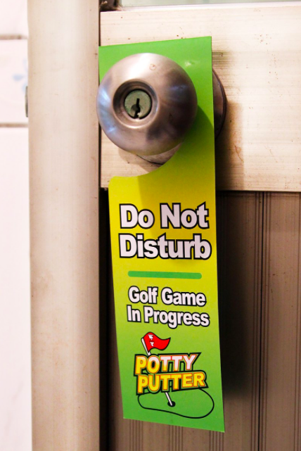 若是在玩高爾夫期間不想受到其他人的打擾,可以將附贈的「球賽進行中禁止打擾」的吊牌掛在門把上,這麼一來,絕對不會有人催促正在廁所玩高爾夫的你XD。小編認為,若是再多買幾支球桿,說不定能在家裡的廁所舉辦高爾夫球聯誼賽(大誤),場地好像太小惹XD