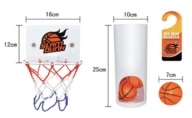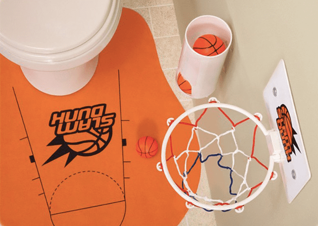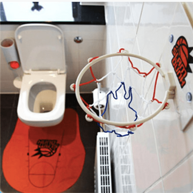 仔細看地墊,連三分線都先幫你畫好,這麼一來,要在廁所進行罰球時相當方便(一個人打籃球有什麼罰球的問題啦XD),雖然球沒有像一般的球軟Q,但還是可以玩得很盡興!建議大家也可以換成迷你的小皮球,這樣在廁所舉辦籃球賽時能玩得更加盡興,啊不過不要不小心將球打進馬桶內!小編救不了你QQ。