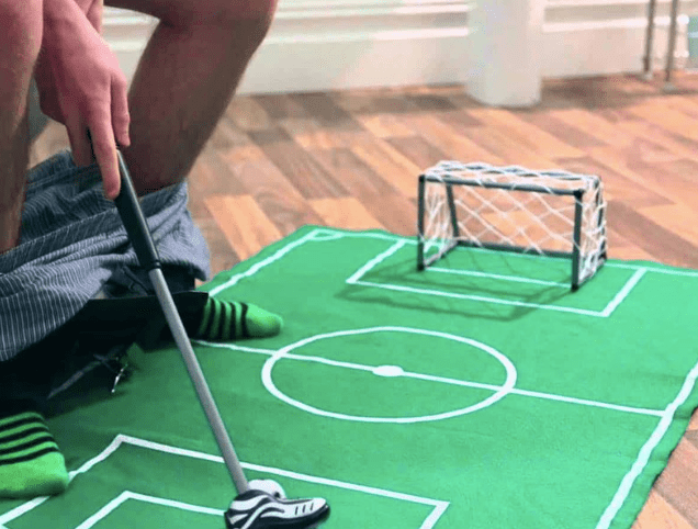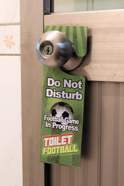 一人足球同樣附有「球賽進行中禁止打擾」的吊牌,掛在廁所門口後,任何人都不能阻止比賽進行!若想要進廁所,抱歉,等球賽結束再說XD。