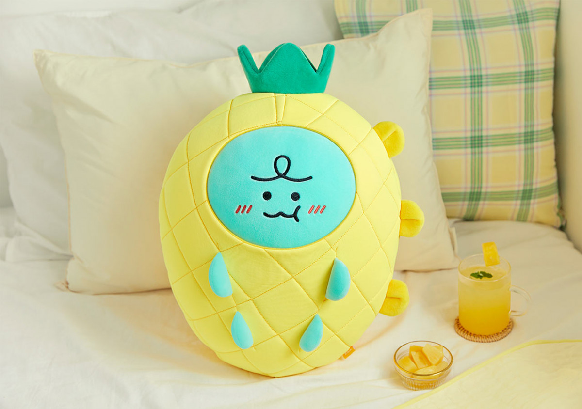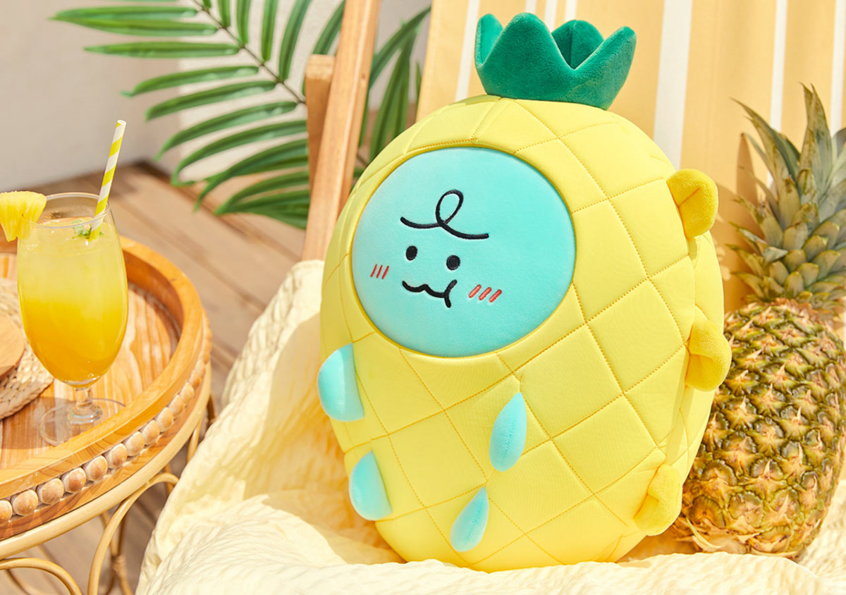 除了經典的Kakao Friends角色,這次Jordy小恐龍也加入了夏季新品行列,變身圓滾滾的大鳳梨玩偶,4隻小腳外露的模樣實在太可愛,Jordy害羞地吃著鳳梨的模樣也讓人看著就好療癒~