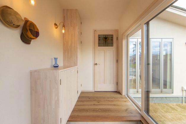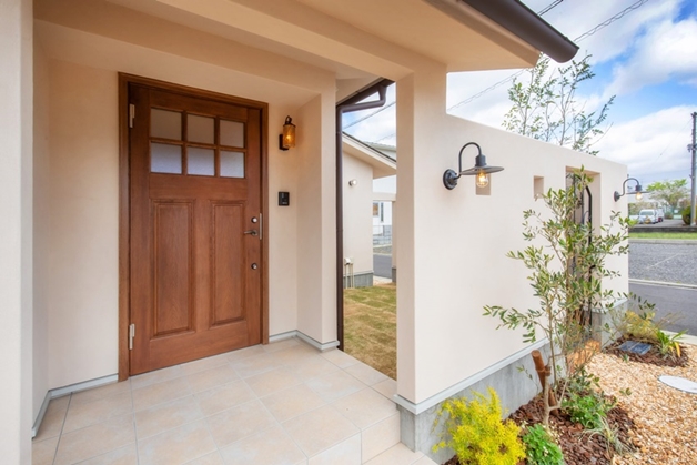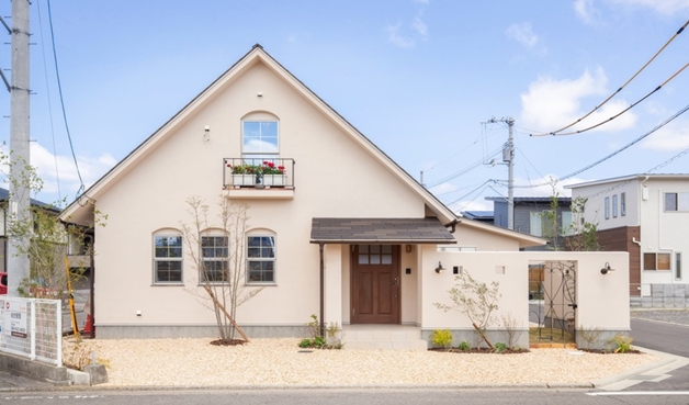 這棟以山形斜屋頂為主要造型的獨棟別墅,是由日本設計團隊 Total Housing Top 所打造,利用顏色深淺不一的灰磚,砌成傳統屋瓦的樣式,視覺上,多了一些古樸的氣息,也與米色系的別墅立面共構出鄉村風情。