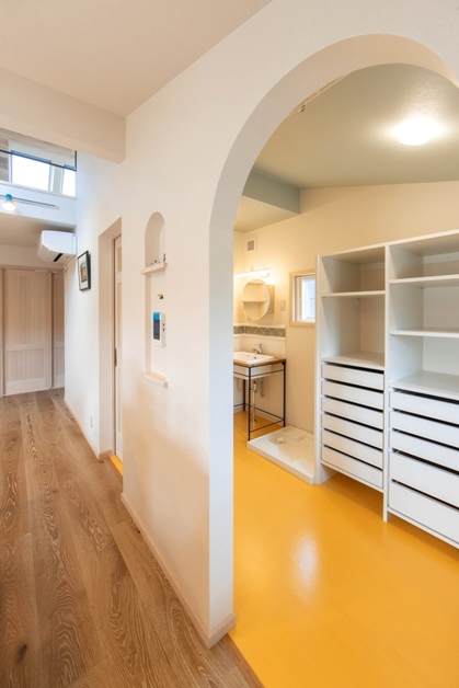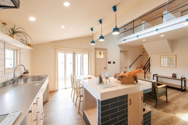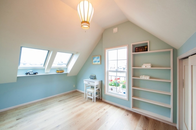 不僅別墅外觀饒富趣味,大斜面的山形屋頂也為空間創造許多的空間趣味,像是一樓以大型中島餐廚為空間的中心,透過從斜屋頂打開的天井,為滿屋引入溫暖的天光,二樓的閣樓則裸現所有原木的架構,透過材質傳遞出溫潤的氛圍,與刻意塗覆的奶油色系漆面牆,構成童趣滿溢的設計語彙。