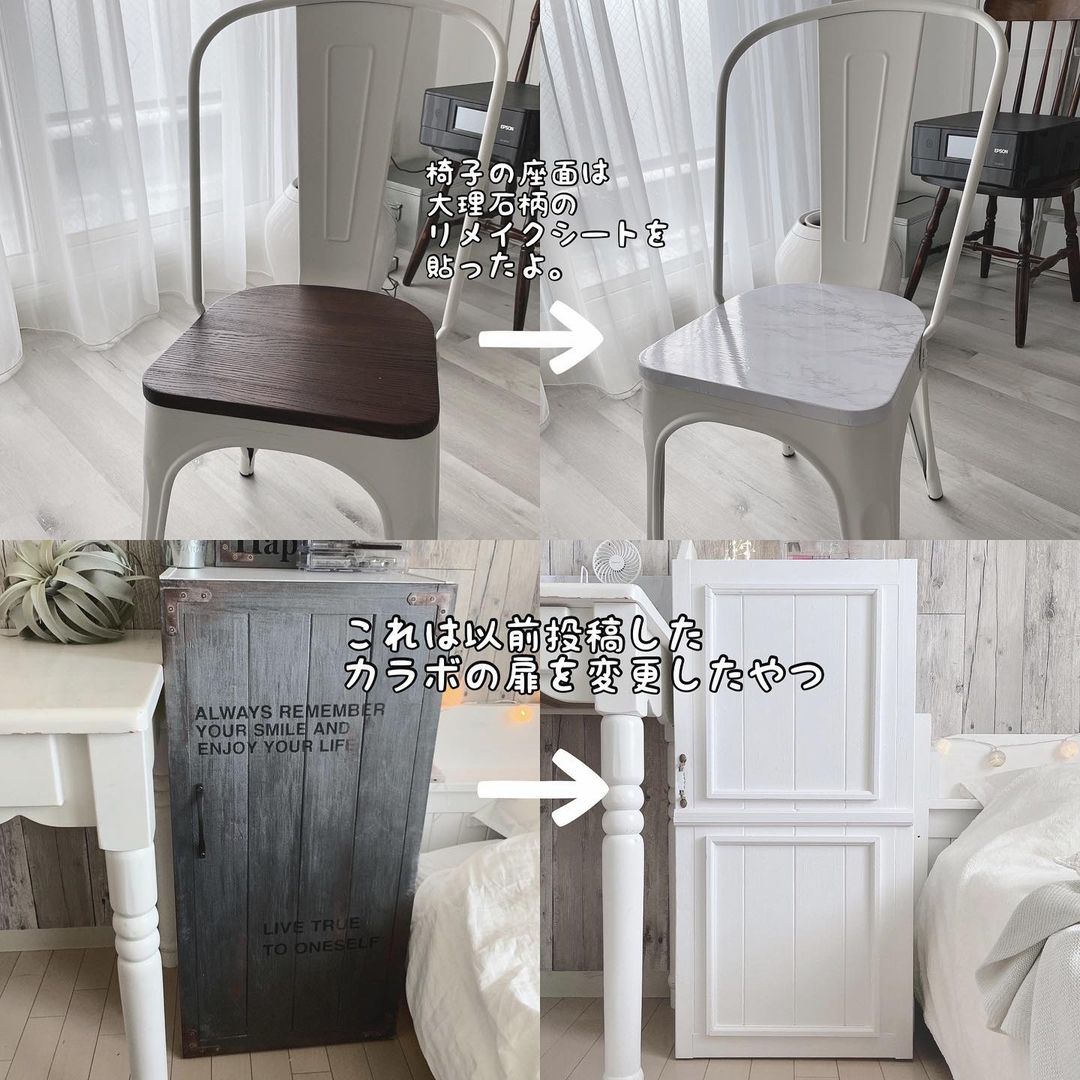 她先是將原本的深色木椅改成白色大理石色釣,床頭櫃同樣從深色黑木板變為白色款式,門也做了變更看起來更加有韻味與主色調更加契合。