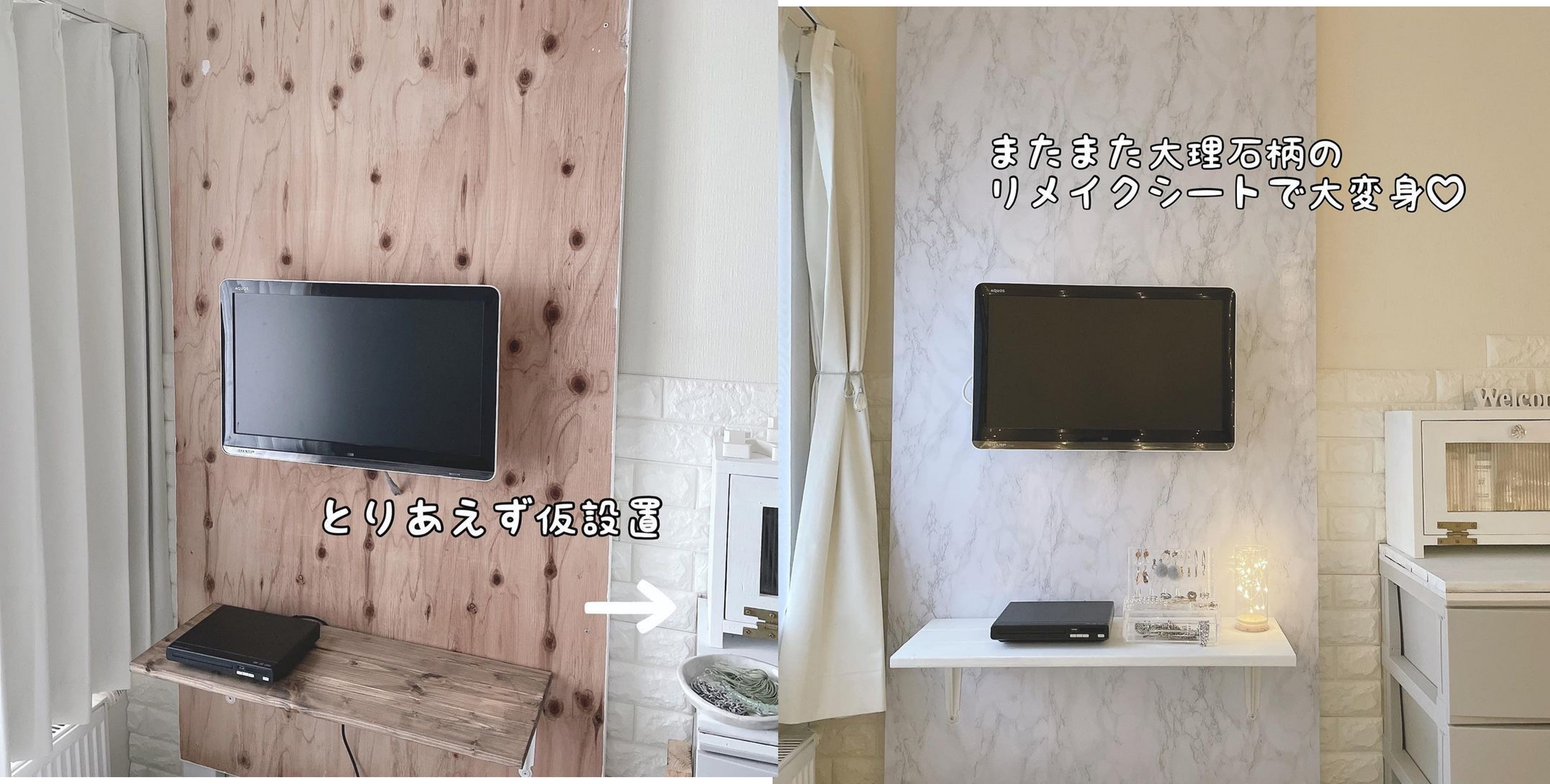 房內的牆面也要做改變,原本為木頭紋的主牆面改為了白色,而面對床的電視牆原本也是日系的木頭紋路,為了呼應韓系主題改為了大理石紋路,房間內原本有很多是深色木頭紋的櫃子,也通通漆成白色,換個顏色整體的感覺也變得很不同,像是買了新的一樣呢~