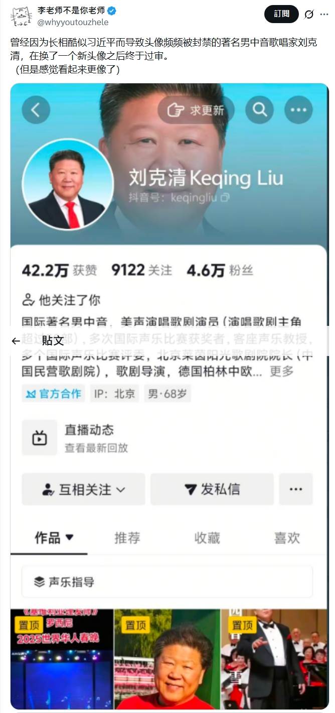 近日,經常關注中國言論審查議題的社群帳號「李老師不是你老師」在X平台分享最新進展,指出劉克清在更換新頭像後,抖音帳號終於通過審核。不過,新頭貼中他身穿西裝、梳著油頭,反而被網友笑稱「看起來更像了」,也有人調侃「你這一換,估計又要被封」。據悉,劉克清已悄悄撤下該頭貼,改用正面近照。