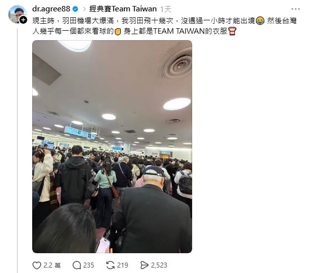 從他分享的照片也可發現機場擠滿旅客,人多到幾乎只能貼著彼此前進;更讓他驚訝的是,放眼望去幾乎清一色都是台灣人,而且大家不約而同都穿著印有「Team Taiwan」的應援服,一看就知道是為經典賽而來。