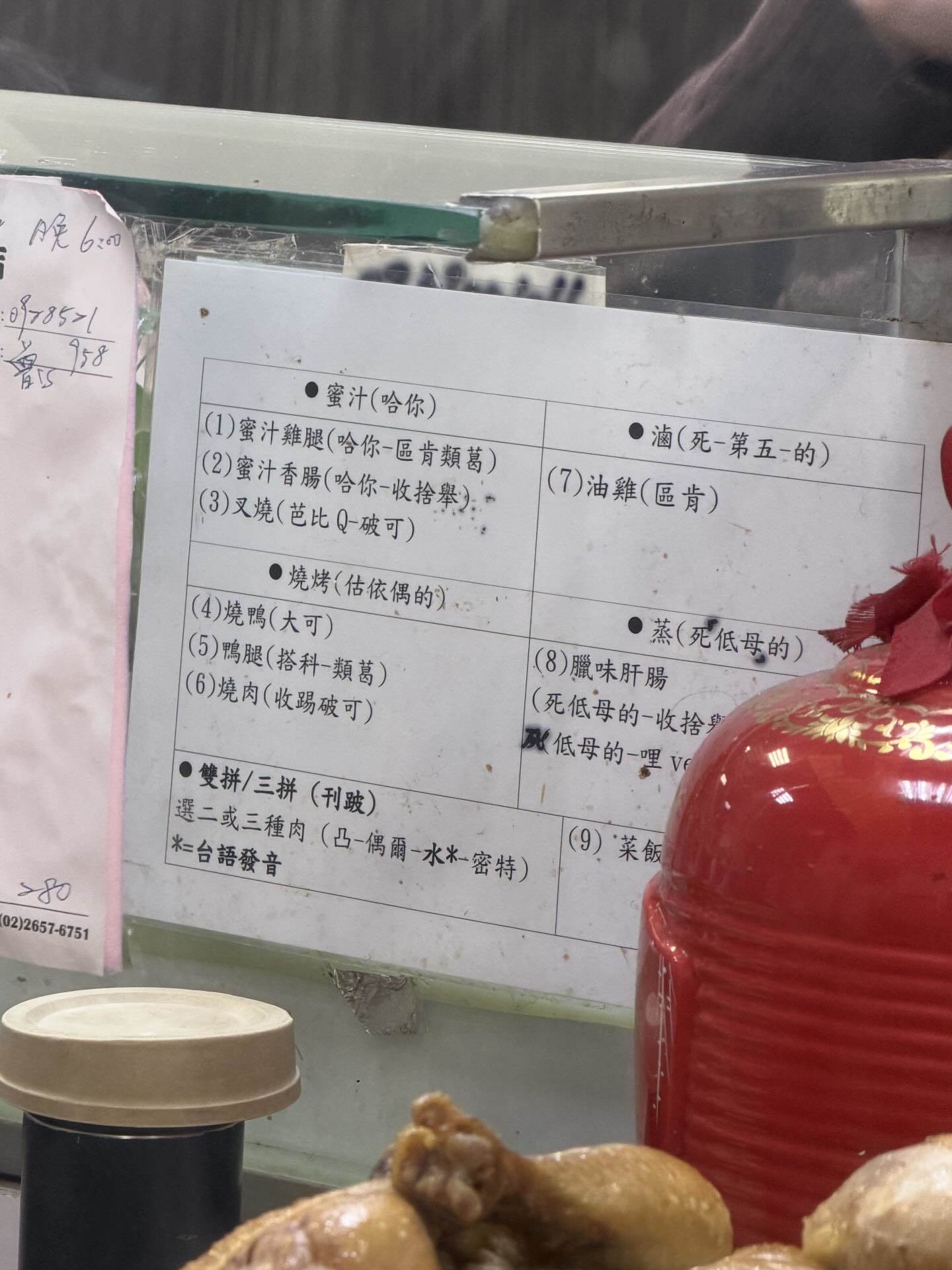 網友在社群平台 Threads 發文,分享自己在享用燒臘時,意外瞥見老闆備忘錄的畫面。這份原本平凡的菜單,卻因為一旁標註的神秘「台語英文翻譯」而瞬間爆紅。仔細看,菜單上將「Grilled(燒烤)」標註為「估依偶的」;「Stewed(滷)」是「ㄙˇ-第五-的」;而「Steamed(蒸)」則是「ㄙˇ低母的」。甚至連複雜的單字,如蜜汁雞腿(Honey Chicken Leg),也被巧妙地翻譯成「哈你-區肯類葛」。