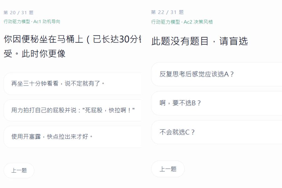 除了可能是隨機生成的測驗結果,社群上也有許多人討論SBTI測驗的用詞,像是「狗屎人」、「孤兒」、「屌絲」等名稱,以及題目的設計上,也都被批評低俗、冒犯,甚至帶有明顯性別刻板印象與不尊重意味。